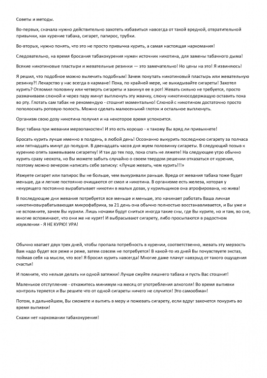 Если Вы хотите бросить курить и много раз пытались бросать это нехорошее занятие, но у Вас не получается бросить курение, то у меня для Вас есть легкий способ помочь в избавлении от этой вредной привычки, сигарет, папирос, трубки, махорки, вейпа, кальяна и любых других табачных изделий. Для получения полной инструкции нужно написать смс или в ватсап, телеграм на номер телефона, либо на электронную почту, мы Вам вышлем файл с информацией, оплата принимается только как добровольное пожертвование, любая сумма, которую Вы посчитаете разумной, если Вам поможет эта инструкция избавиться от курения табака. Любой стаж курения не препятствие для этого способа!